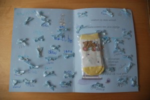 Van heel veel mensen hebben we de afgelopen weken kaarten gekregen, waar hele bijzondere bij zaten. Zo kregen we deze week een grote kaart van basisschool De Globe in Hoevelaken, waar mama tot de zomervakantie nog werkte en de kinderen mij in mama’s buik konden zien groeien. De kaart is helemaal volgeplakt met blauwe strikjes en alle leerlingen hebben hun naam op de kaart geschreven. Ook zat er nog een pakketje met sokjes in (alsof mama en papa al niet genoeg verwend waren afgelopen zomer door de leerlingen en leerkrachten van De Globe, zie de website marcenvera.nl voor meer info hierover). Bij deze willen papa, mama en ik jullie heel erg bedanken!