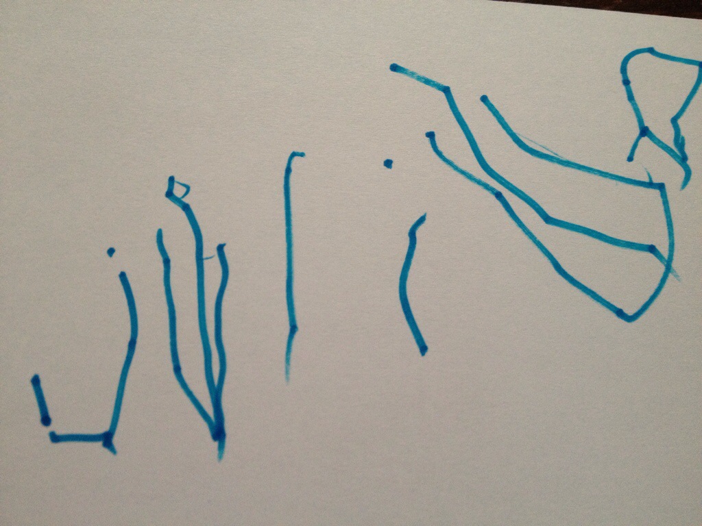 Vanavond heb ik geoefend met schrijven. Ik heb het woordje ik geschreven en mijn naam. Mama deed het voor en ik schreef het daarna na.