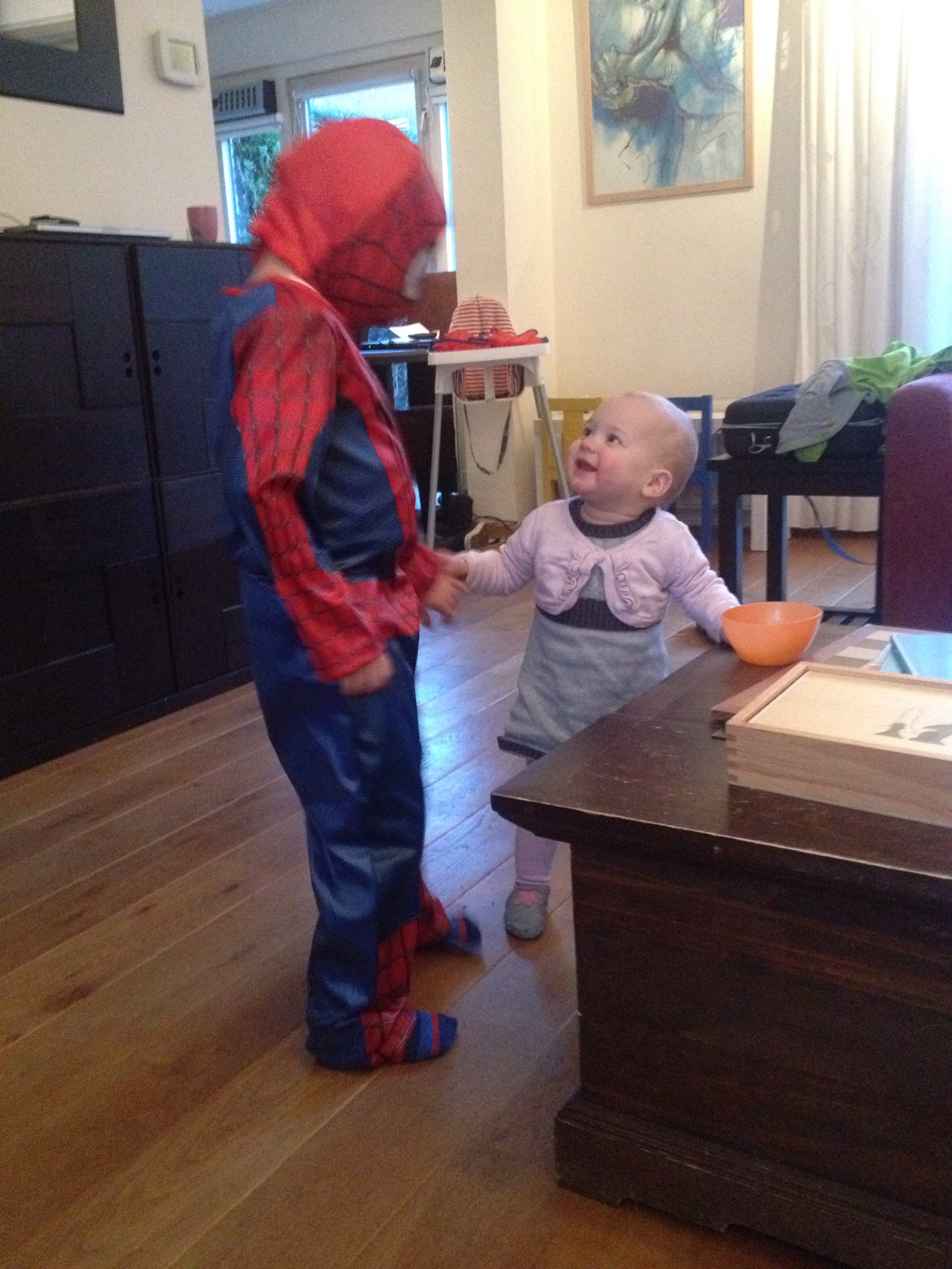 Ik heb een Spider-Man-pak gekregen! Wat ben ik daar blij mee. Ik vind het ook wel een beetje een Superman outfit. Ik ren graag rondjes door de woonkamer op zoek naar mensen in nood…