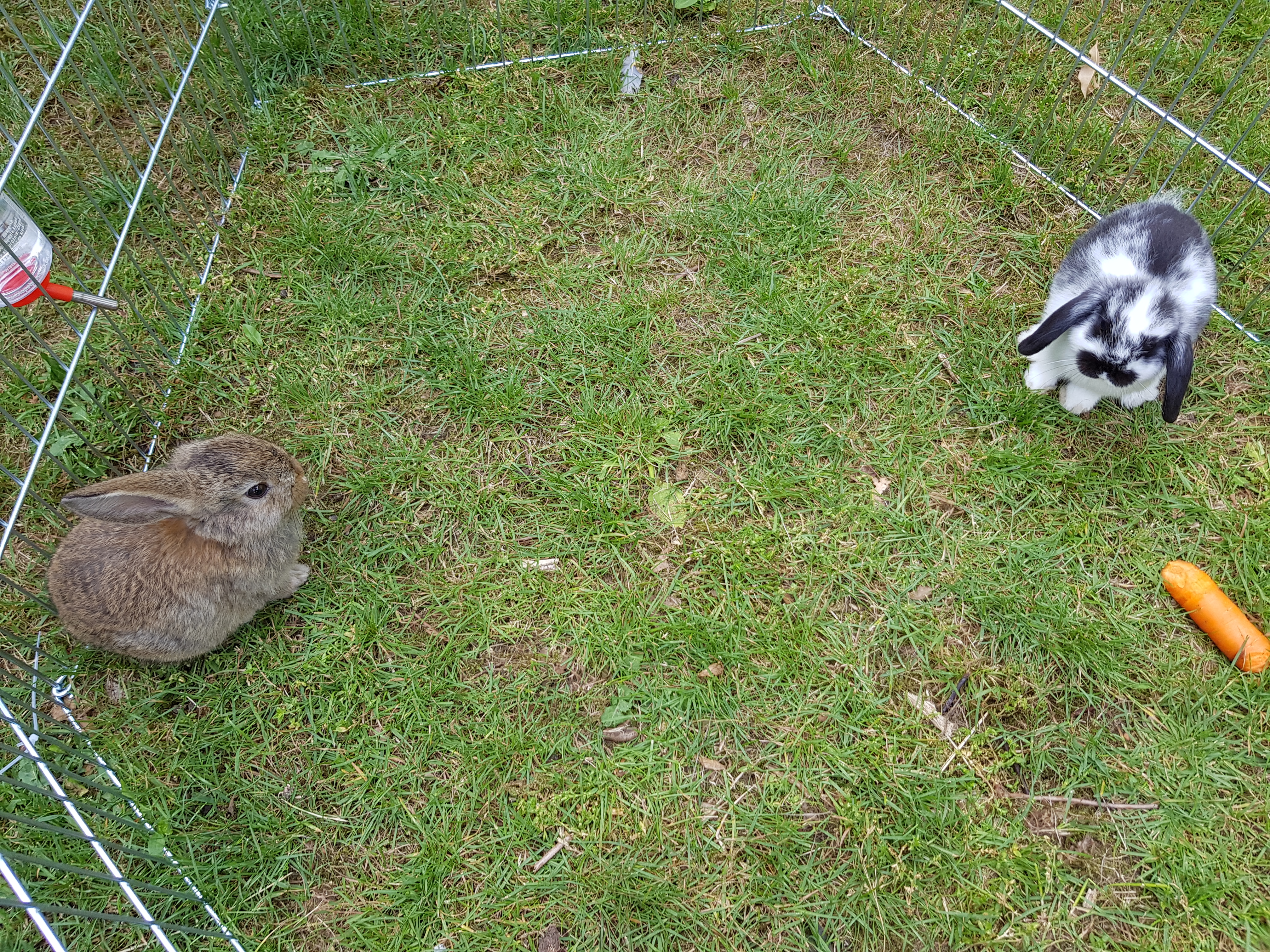 Naast 2 kippen en een konijn hebben we sinds zondag ook nog 2 kleine konijntjes.